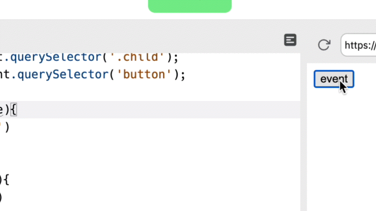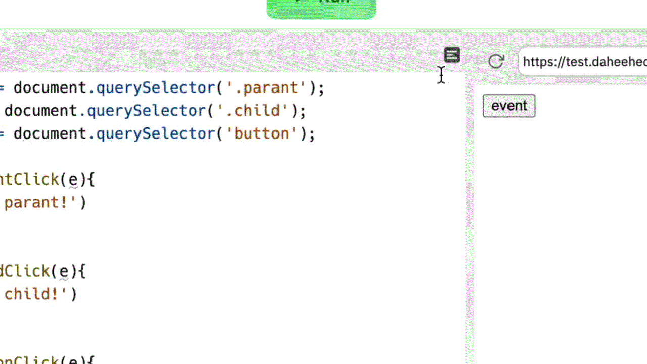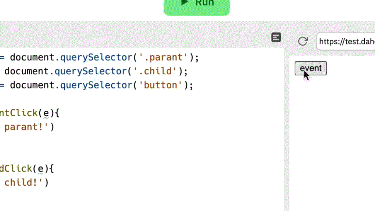 아래 코드를 실행해보면 나는 버튼을 클릭했는데 버튼에 바인딩 된 이벤트 뿐만이 아니라 parant와 child에 바인딩 된 이벤트 까지 실행된다.