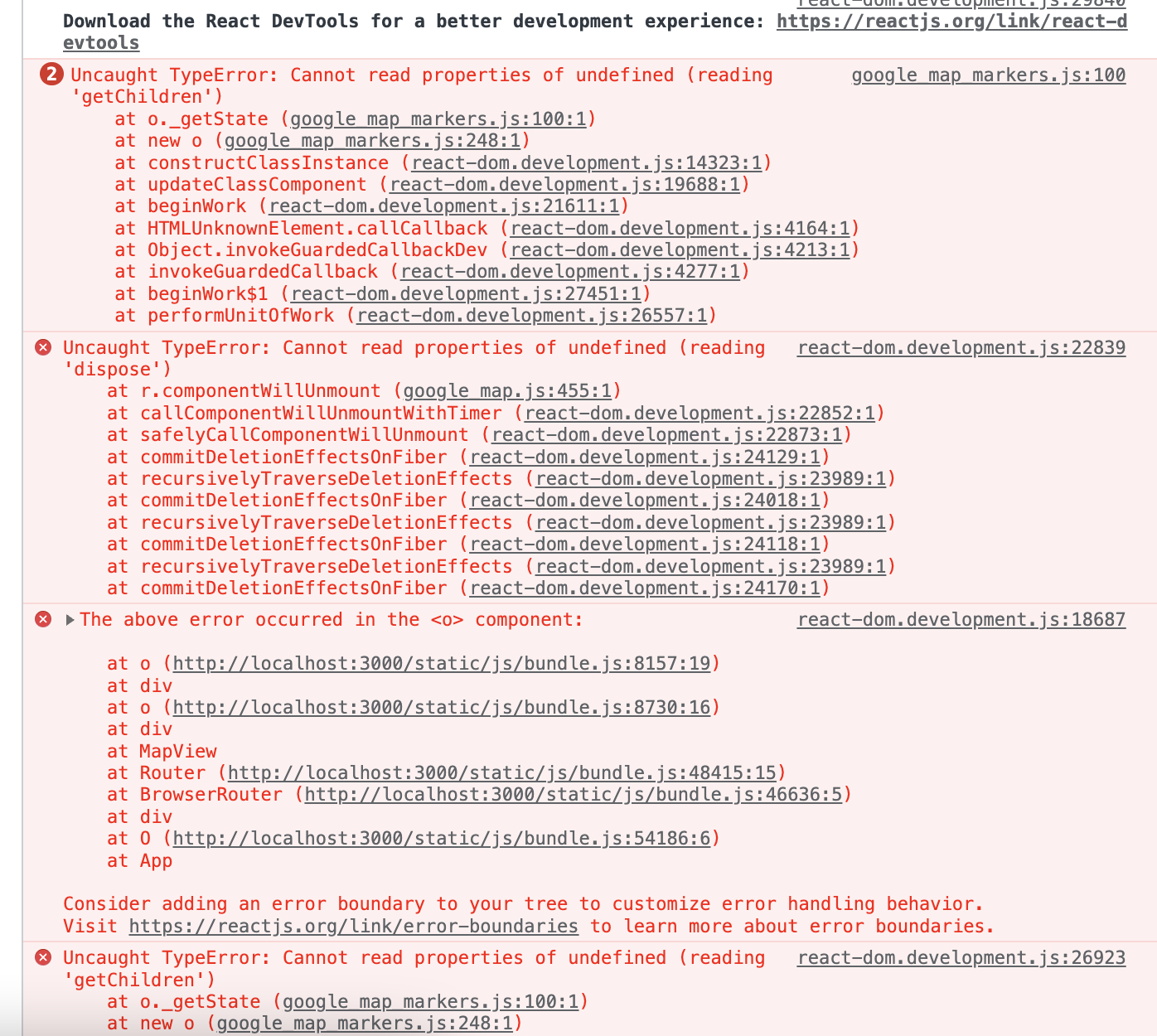 google-map-react 깃허브에 가서 찾은 결과 해결방법은 index.js파일에 있는 <React.StrictMode>를 비활성화 시키면 됐었는데 해당 방법대로 해보니 확실히 에러 없이 잘 나오긴 했다.